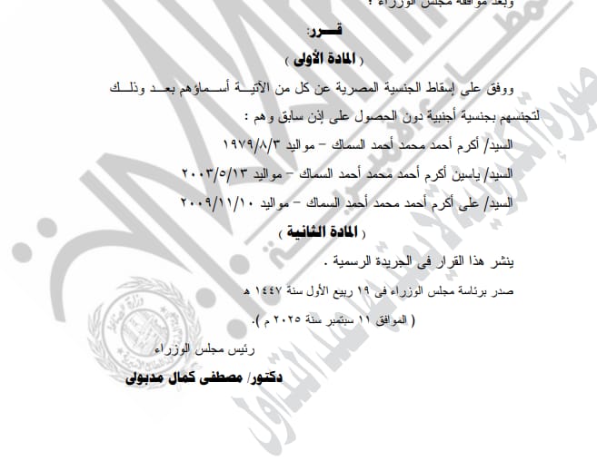 نشرت الجريدة الرسمية قرار الدكتور مصطفى مدبولي رئيس مجلس الوزراء بإسقاط الجنسية المصرية عن المواطن أكرم أحمد السماك ونجليه ياسين وعلي، وذلك بعد تجنسهم بجنسية أجنبية، في خطوة تعكس موقف الدولة الحاسم تجاه القضايا المرتبطة بالأمن القومي.
