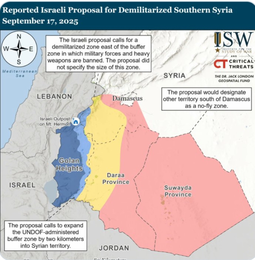 أصدر المعهد الأمريكي لدراسات الحرب (ISW) خريطة تفصيلية قال إنها تعكس مقترحًا لتقسيم المنطقة الجنوبية من سوريا، في إطار ترتيبات أمنية مستقبلية على الحدود مع إسرائيل.